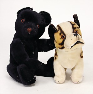 2 Plüschtiere, 1 x Hermann Teddy, schwarz, 31 cm, 1 x Bully, mit Knopf, Stehhöhe 20 cm, alles bespielt