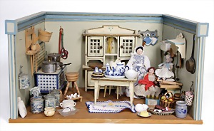 Puppen-Küchengehäuse, 56 x 36 x 30 cm, kompl. überstrichen, mit altem Holzmobiliar, Küchenschrank, Tisch, Stuhl, Bank, kl. Blechherd, reichh. Zubehör, Porzellan Geschirr, Glasteile, Salz- u. Mehlmetze, 2 Teedosen, Blech lithogr., altersbed. kl. Roststellen