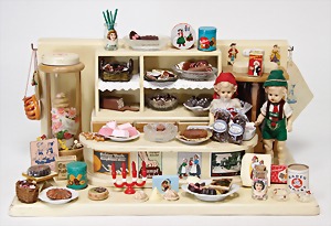 Kaufladen, Rückfront aufgesteckt, 40 x 20 x 25 cm, eingerichtet als Konditorei, mit Kaffeebohnenspender, runde Schauvitrine, Theke, reichh. Zubehör an Masse-Gebäck, dazu 2 Masse-Puppen, ca. 15 cm