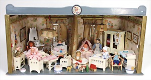 Puppenstuben-Gehäuse, kompl. überstrichen, 63 x 34 x 30 cm, mit Kinderzimmereinrichtung, Puppenwiege, Draht-Bett, Kommode, Schrank, 1 Waschtisch, Blech, kompl. überstrichen, kl. Sitzgarnitur, Pappe geprägt, mit Couch, 2 Sessel, 1 runder Tisch, 1 Blumenständer, u. anderes, einige Masse- u. Biege-Püppchen