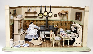 Puppenküche, 72 x 36 x 35 cm, mit Puppen-Herd, Blech, Front emailliert, mit passendem Topfsatz, etwas Holzmobiliar, Geschirrschrank, Tisch, 3 Stühle, 1 Bank, kompl. überstrichen, dazu einige Teile Porzellangeschirr, 3 Porzellan-Brustblattkopf-Puppen, 2 x glasiertes Porzellan, modellierte Frisuren, Stoffkörper