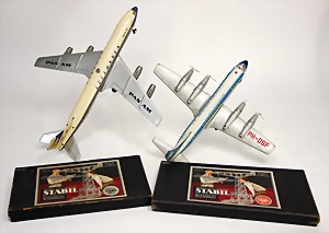 2 Blech-Flugzeuge, 1 x KLM, 1 x Lufthansa Boeing 707, alles bespielt, Kleinteile fehlen, dazu 2 Stabil Metallbaukästen, 49A u. 50A, im Orig.-Kart., mit Anleitung, auf Vollständigkeit nicht überprüft