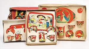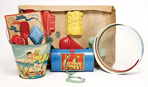 Blechspielzeug, 2 Sandförmchen, lackiert, auf Orig.-Tableau, 1 Sieb-Blecheimer, 1 Botanisiertrommel