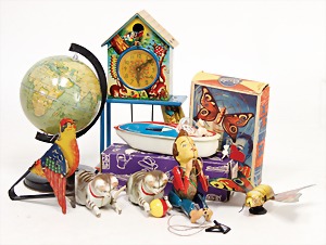 Konv. Blech-Spielzeug, kl. Motorboot v. MS, Uhrwerk intakt, Ritterfigur, 2 Köhler Katzen, 1 x fehlt der Ball, Schmetterling v. Gescha, Uhrwerk intakt, 1 Druckspiel Vogel mit Blasebalgstimme, 1 Globus, 1 Uhr, Uhrwerk defekt