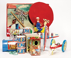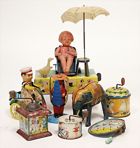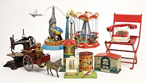 Konv. Blech-Spielzeug, Karussell, Spardose, Laufrad, Telefon, Elefant mit Fliegern, kl. Karussell, Eselswagen, kl. Nähmaschine, 1930 – 1970, bitte besichtigen, bespielt