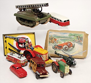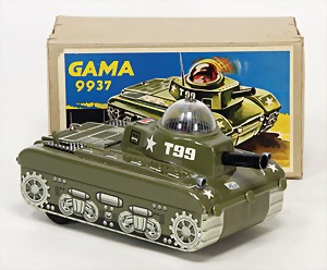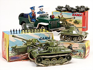 Konv. Blech-Spielzeug, darunter 2 x Gama Tank, beides im Orig.-Kart., 1 Leerkart. F. Gama Montagetank 654, 1 kl. Blech-Kanone, 5 kl. Kunststofftanks v. RMM, mit kl. Figürchen, 1 US Jeep P.D. Patrol, batteriebetrieben, auf Funktion nicht überprüft