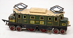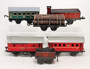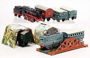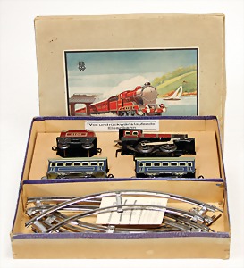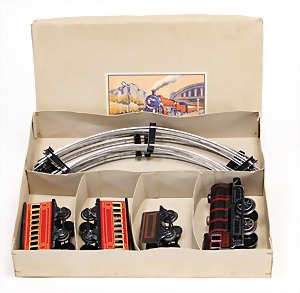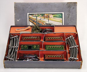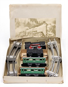 Zugpackung, Spur 0, Schlepptender-Lok B, 18 Volt, schwarz mit roten Zierlinien, 4 Personenwagen, 1 Gepäckwagen, Gleismaterial, mit Anleitung, im Orig.-Kart., Kart. altersbed. etwas verschlissen, sehr guter Zust.