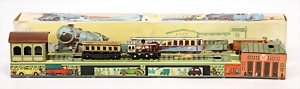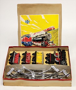 Blech-Eisenbahn, Spur 0, vor- u. rückwärtslaufende Eisenbahn, Lok mit Tender, 2 Waggons, Schienenmaterial, mit Anleitung, im Orig.-Kart.