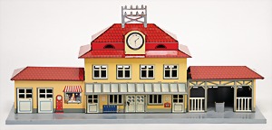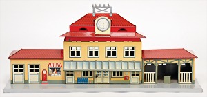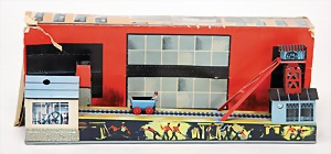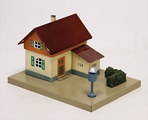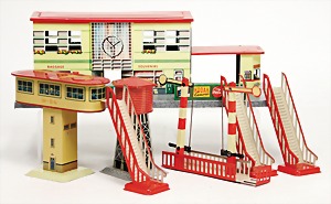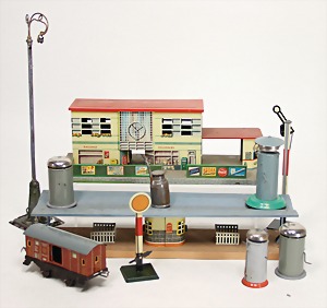 Blech-Bahnhof, ungem., Grundplatte 40,5 x 16 cm, dazu 1 Signalbrücke, Stellwerk u. Wasserturm, ungem.