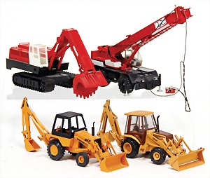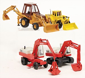4 Modell-Fahrzeuge (Baufahrzeuge), Metall, Maßstab 1:35, Aufschrift „Case“, 1 Bagger Kunststoff, Poclain, 1 Kranausleger PPM, Metall