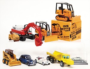 Konv. 6 Baustellenfahrzeuge, Metall, darunter 3 x Case, Maßstab 1:35, MCG Modelle, 3 Raupen, 1 kl. Walze, dazu Volvo BM Dumper v. Solido, 1 x Gescha Raupenbagger 160, Aufschrift „Poclain“, 2 Pkw Modelle 1 x Maßstab 1:43, BMW, Metall-Modell, 1 x BMW Z3, Kunststoff-Modell, 1:87