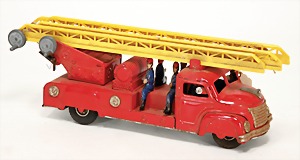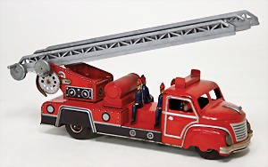 Feuerwehrauto 838, Blech lithogr., Leiter Kunststoff, Uhrwerk intakt, bespielt, gut, 32 cm