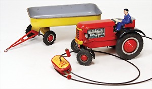 Traktor, Blech lithogr., Spiralfederantrieb, mit Anhänger, L: Traktor 17 cm, leicht bespielt, gut