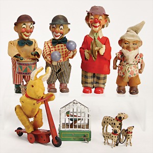Konv. Clownfiguren, 18 – 21 cm, 1 Zwerg, 1 Hase auf Dreirad, 1 Vogelkäfig, Vorkrieg, Blech lithogr., 3 Dalmatiner Karl