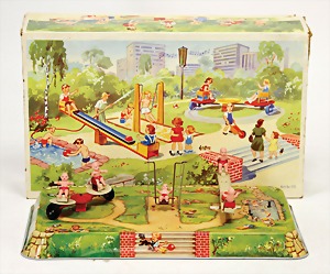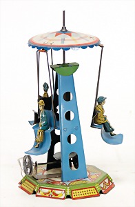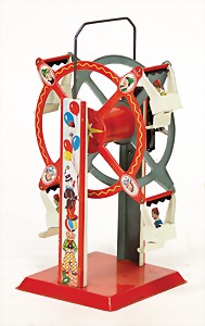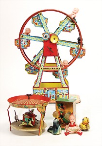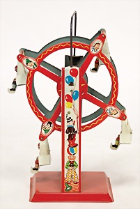 Konv. Blech-Spielzeug, Riesenrad, Blech llithgr., 41 cm, altersbed. Lackfehler, ein wenig Flugrost, Uhrwerk intakt, dazu 1 Karussell, deutsch, Figuren wohl ergänzt, kl. Blech-Spardose