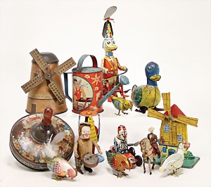 schöne Fundkiste, Blech-Spielzeug, Schuco Tanzfigur, Clown mit Trommel, Karl Dressurreiter, 2 Kletteraffen, Karussell, Kutsche, Affe, Windmühle, Enten, Reiseeimer, bespielt bis stärker bespielt, bitte besichtigen