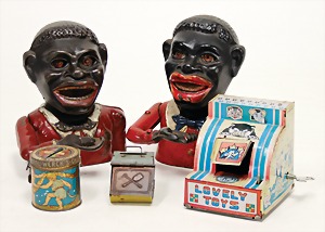 2 Spardosen, Eisenguss, 16 cm, 1 Spardose, Blech, wohl Japan, Deckel unten fehlt, kl. Spardose Stollwerk, 1 Kohlenschütte Spardose, Blech ltihogr.
