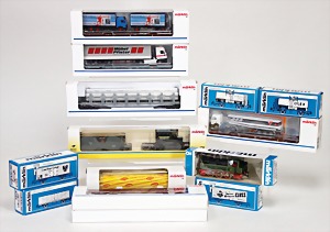 H0, Konv. Güterwagen, 14 Teile, 4683, 4782, 4675, 4795, 4780, 4841, 4841, 47423, 47715, 6301, 4740, 4835, 47403, neuwertig, Orig.-Kart., 1 Tenderlok, grün, 3087 ,ohne Kart.