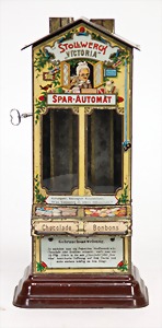 Schokoladenautomat, 27 cm, Blech lithogr., mit Märchen-Motiven, Hänsel u. Gretel,guter Zust.