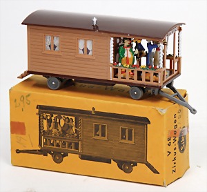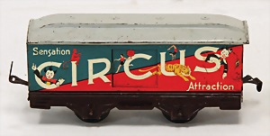 Zirkuswagen, wohl Karl Bub, Vorkrieg, 2-achsig, Spur 0, 16 cm, Blech lithogr., bespielt, Orig.-Zust.