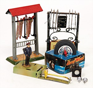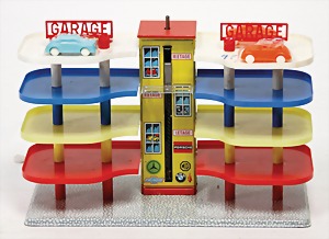 Garagenturm, Blech- u. Kunststoffteile, Antrieb intakt, 3 Fahrzeuge, mit Shell Schild, guter Zust.