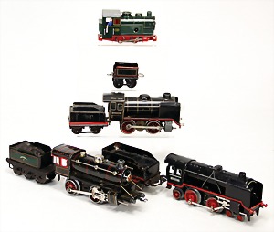 Lok mit Tender, zum Aufziehen, Spur 0, Uhrwerk intakt, mit 2 Waggons, dazu 1 E-Lok, zum Aufziehen, Uhrwerk defekt, Firma Bub, mit 3 Waggons, 1 Tunnel, 1 Brückenteil v. Mettoy, Made in Großbritannien
