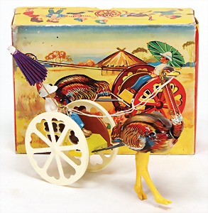 Konv. 4 Teile Blech-Spielzeug, Celluloid-Mädchen mit Schiffschirm u. Ente, auf lithogr. Blech-Sockel, Japan, Uhrwerk defekt, bespielt, gut, Blöhmer & Schüler Jumbo Elefant, bespielt, Uhrwerk intakt, teilw. Flugrost, 10 cm, Junge auf Dreirad, Blech- u. Kunststoffteile, China, 1 Flugrad, Blech, Weihnachtsmann, Geräusch-Spielzeug, Blech, 3 Spieldosen, Blech, bespielt, Lackfehler