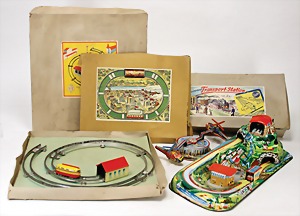 Konv. Eisenbahn, bunt lithogr. Bahnhof, L: 40 cm, H: 18 cm, dazu 1 Bahnsteigsperre, 1 Laterne, Bing, Uralt, 39 cm, ohne Kette, Lackfehler, 1 Signal-Brücke, 2 Läutewerk, Signale, 1 gedeckter Güterwagen HWN, 1 Ölkanne, teils sehr guter Zust., Lagerfund
