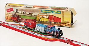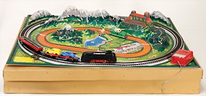 Berg-Wendebahn, Blech lithogr., 34 cm, Lore mit Fahrer, guter Zust., Uhrwerk intakt, Orig.-Kart., 2 Seitenlaschen fehlen