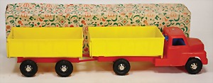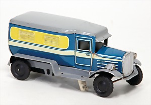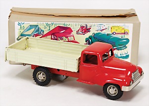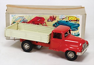 Kipplaster, Blech, 34,5 cm, Friktionsantrieb, kl. Druckstelle am Dach, sonst neuwertig, Orig.-Kart.