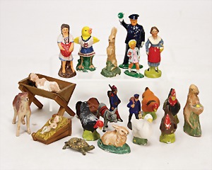 Konv. Masse-Figuren, untersch. Hersteller, Bauernhoftiere, Magd mit Korb, 7,5 cm, Eselswagen, dazu 1 Bahnhofsfigur, 1 Figur Blech lithogr., 1 Figur Eisenguss, meist guter Zust., teils kl. Fehler, 1 Jesuskind