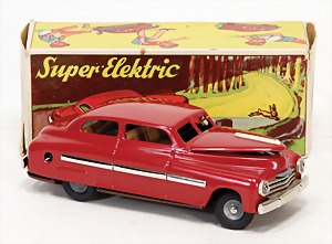 Super- Elektric Limousine, U.S-Zone, Uhrwerk intakt, elektr. beleuchtete Frontscheinwerfer, unbespielt, Orig.-Kart., mit Anleitung, Bodenplatte etwas locker