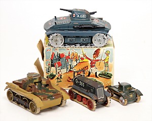 Tank, Blech lithogr., 14 cm, Blechketten, Uhrwerk defekt, Orig.-Kart., 1 Seitenlasche fehlt, Lagerungsspuren, ein wenig Flugrost, Gescha kl. Tank, Uhrwerk klemmt, sonst gut, kl. russischer Tank, Uhrwerk klemmt, 7 cm, sonst gut, 1 Kettenfahrzeug, Kellermann, CKO 635, 10,5 cm, Uhrwerk intakt, Orig.-Gummiketten, guter Zust.