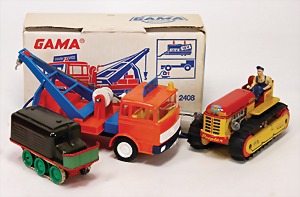 Gama, 2408, Kranwagen, Kunststoff, Made in Western Germany, 24 cm, neuwertig, Orig.-Kart., Arnold Raupenschlepper, 7000, Baterienfach verrostet, LBZ Raupenschlepper, Kunststoff, Blechteile, Uhrwerk intakt