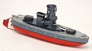 Schlachtschiff, Blech lithogr., 25 cm, Uhrwerk intakt, leicht bespielt, kl. Kratzer am Rumpf, sonst guter Zust.