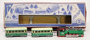 Eisenbahn, Penny Toy, Blech lithogr., US-Zone, Tenderlok mit 2 Personenwagen, insgesamt 28,5 cm, Uhrwerk intakt, neuwertig, Orig.-Kart.