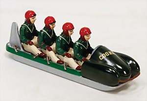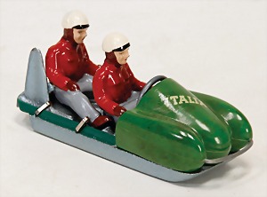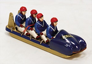 Bob Wulf Wisnewski, München, 4 er Bob, Blech, 10,5 cm, unbespielt, italienische Mannschaft, Aufschrift: Italia, mit Anleitung, 50 er Jahre