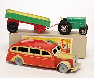 900, Bus, Blech lithogr., 23 cm, Uhrwerk defekt, Flugrost an der Windschutzscheibe, dazu Gescha Traktor mit Anhänger, Blech, Ausführung ohne Antrieb, 1 Rad fehlt, sonst unbespielt, mit kl. Lagerungsspuren, im Orig.-Kart.