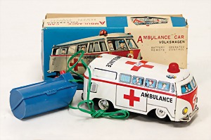 VW Bully, geteilte Frontscheibe, Ambulance, Japan, TN, Blech lithogr., 13 cm, Kabelsteuerung, neuwertig, Orig.-Kart., techn. nicht geprüft
