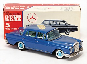 Heckflosse, Japan, Blech lithogr., Baterieantrieb, elekt. beleuchtete Frontscheinwerfer, Blink-Einstellungen, 28 cm, neuwertig, Orig.-Kart., mit Stern