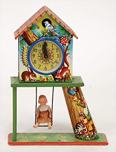 Schaukel mit Uhr, Blech lithogr., 24,5 cm, guter Zust., Uhrwerk intakt, minim. Stelle etwas angelaufen