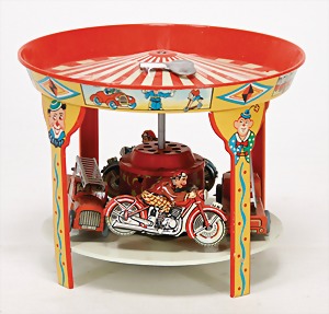 Karussell, Blech lithogr., 14 cm, 2 Motorräder, 2 Feuerwehrautos, Uhrwerk intakt, sehr guter Zust.