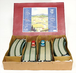 Autobahn, U.S. Zone, mit Käfer mit Brezelfenster u. Autobus, Uhrwerke intakt, schöner Orig.-Zust., kl. Lagerungsspuren an den Fahrzeugen, im Orig.-Kart., mit bunt lithogr. Deckbild