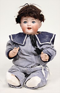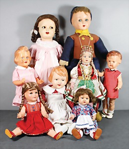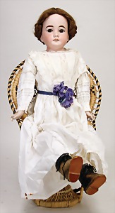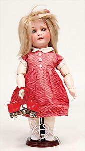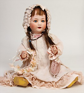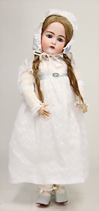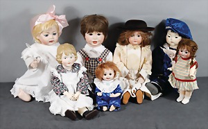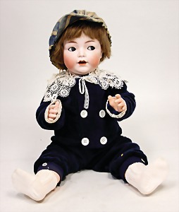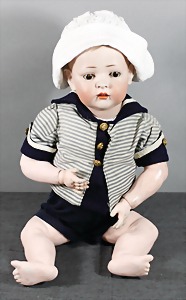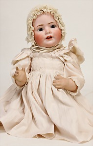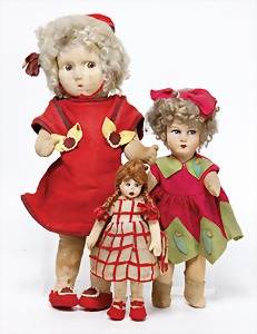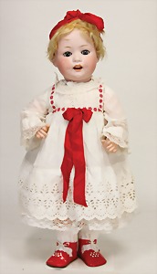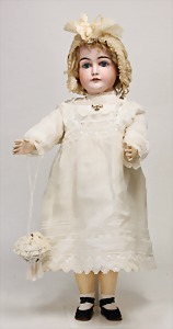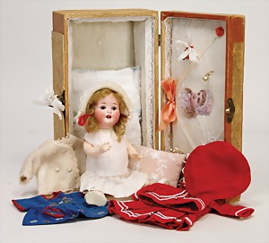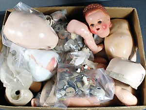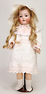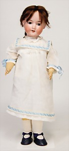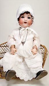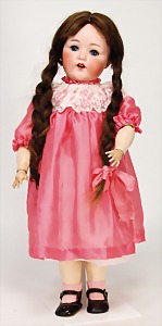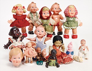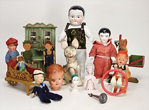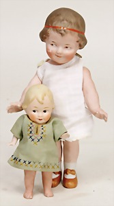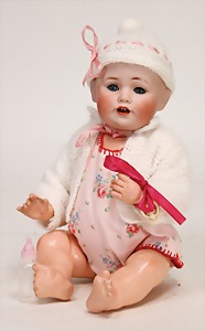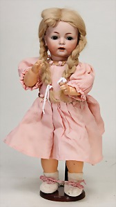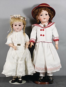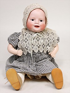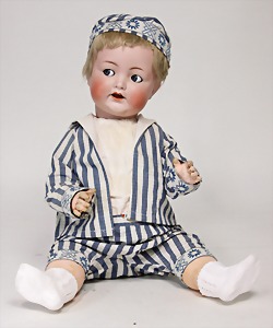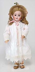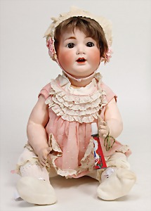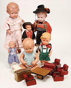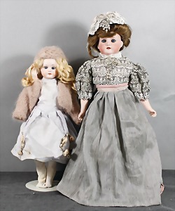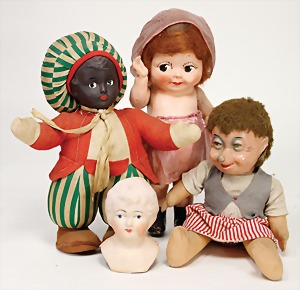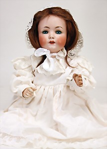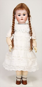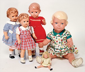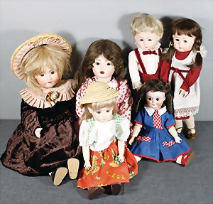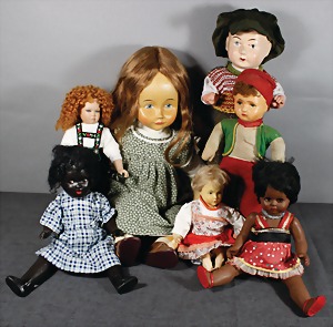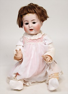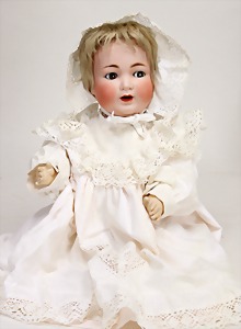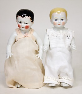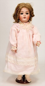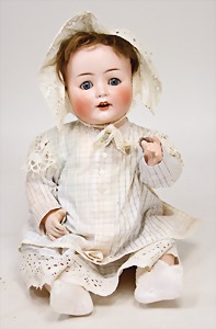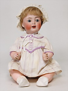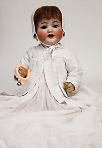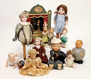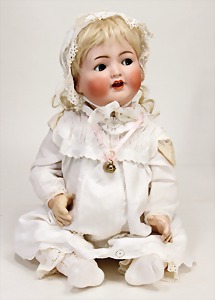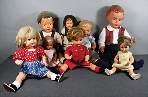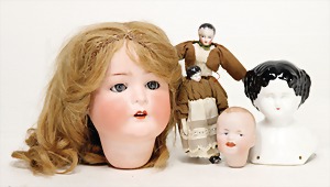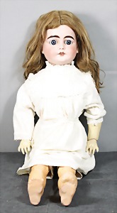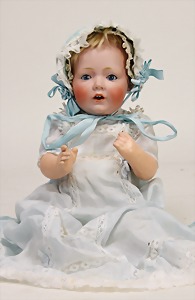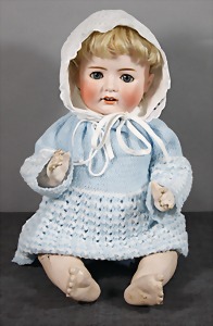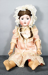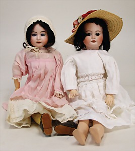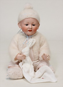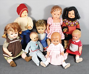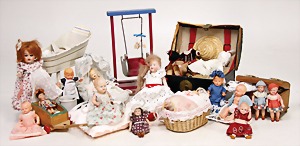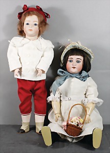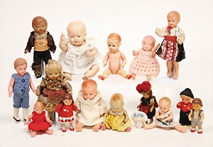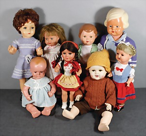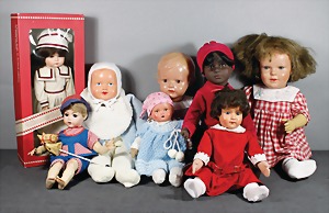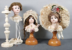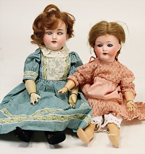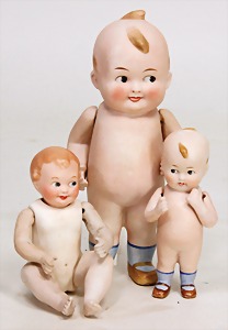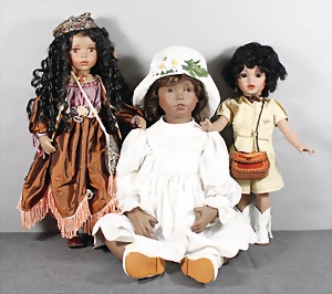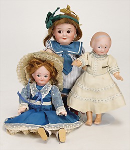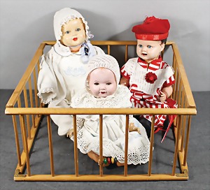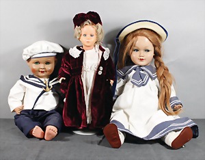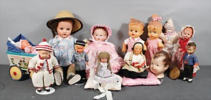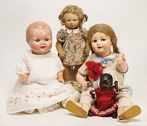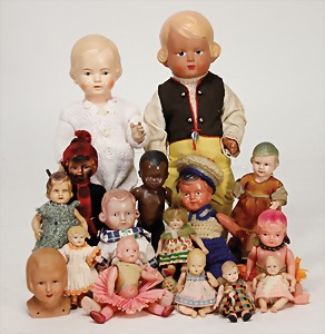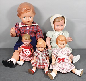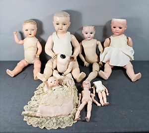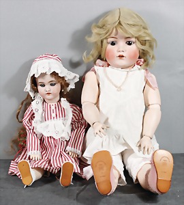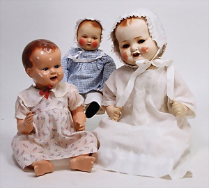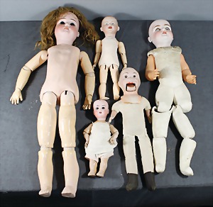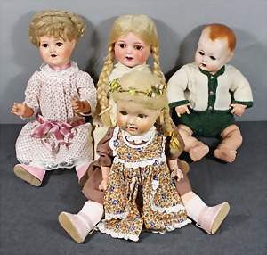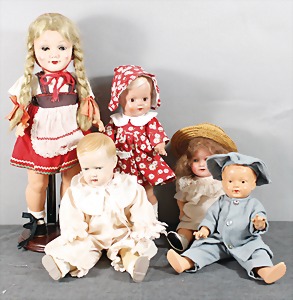 3 Puppen, 1 x Porzellan, gem. AM 360N, Hinterkopf geklebt, blaue fest eingesetzte Glasaugen, off. Mund, Zähne, Echthaarperücke, Masse-Sitzbabykörper, mit abstehendem Zeh, Körper stark bespielt, stellenw. überstrichen, 29 cm, 1 x Masse-Puppe, gem. Heubach Köppelsdorf 342, blaue Schlafaugen, off. Mund, Zähne, Echthaarperücke, Masse-Stehbabykörper, rechter Fuß fehlt, 25 cm, 1 x Kunststoff-Puppe, gem. Pedygree Made in England, blaue Schlafaugen, off. Mund, Zähne, Kunsthaarperücke, 39 cm