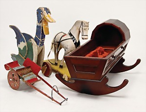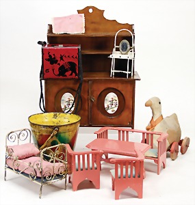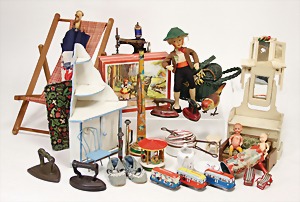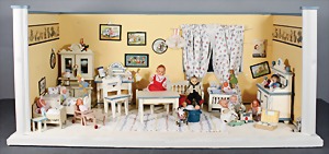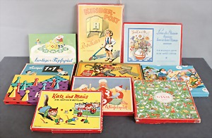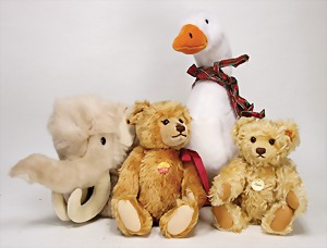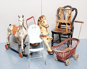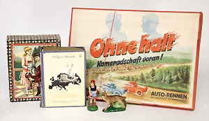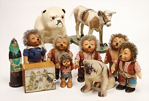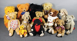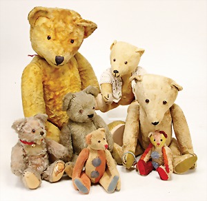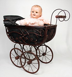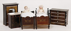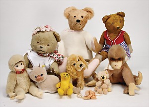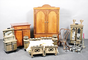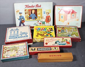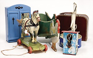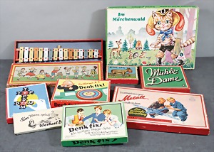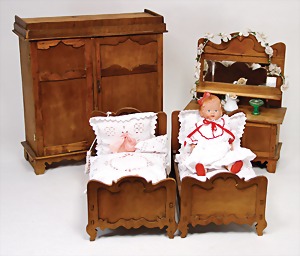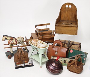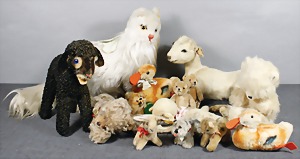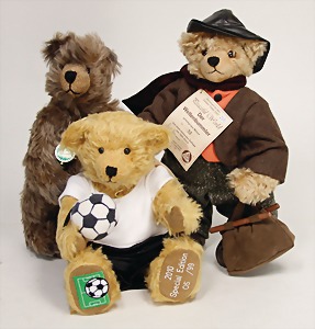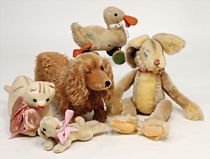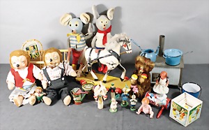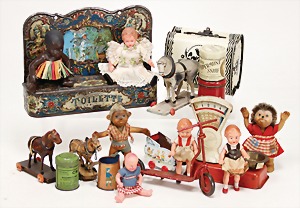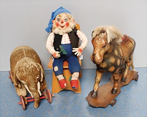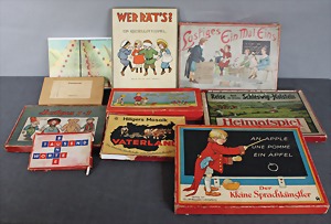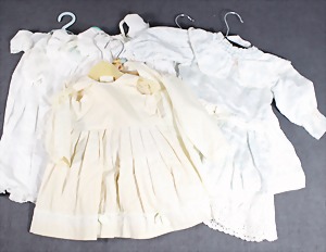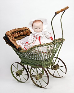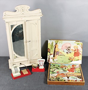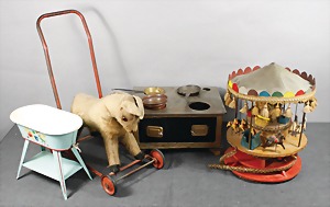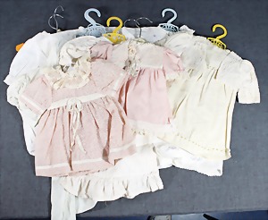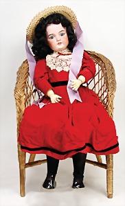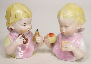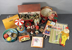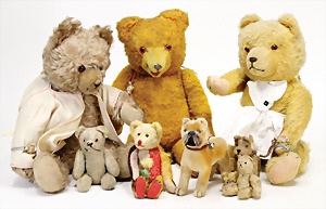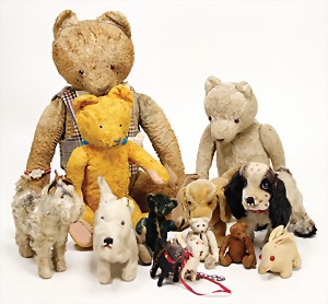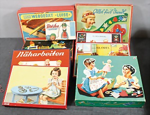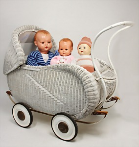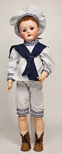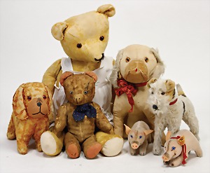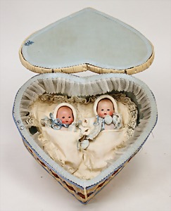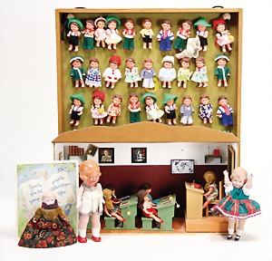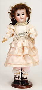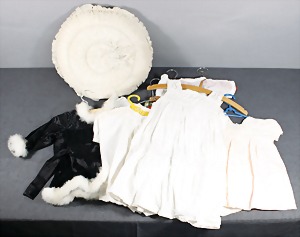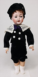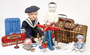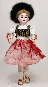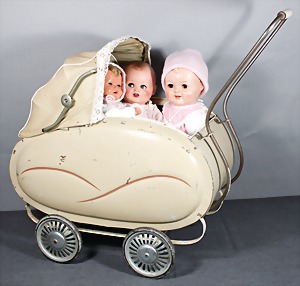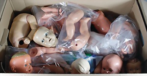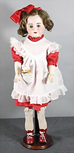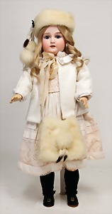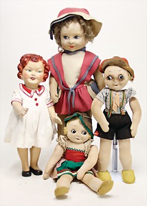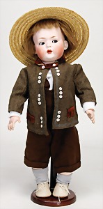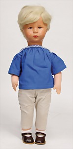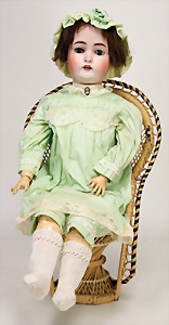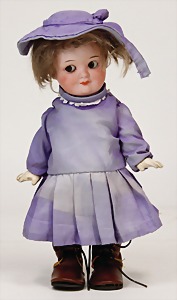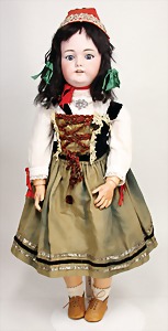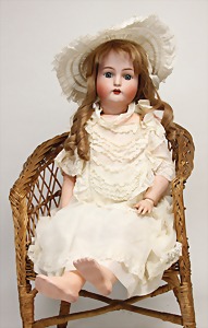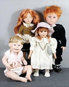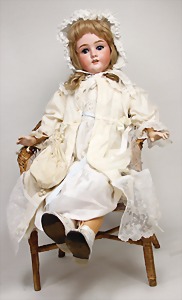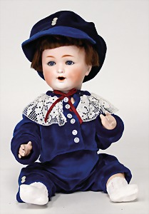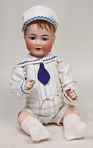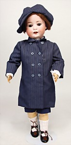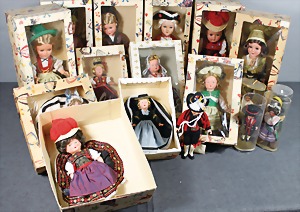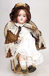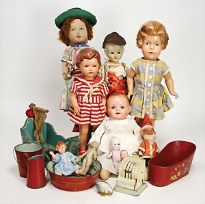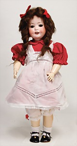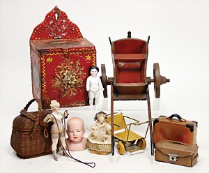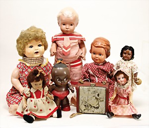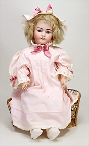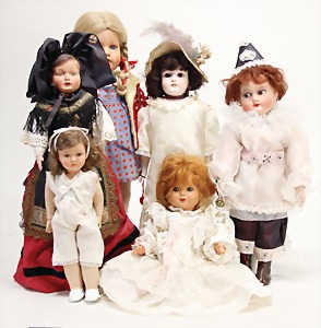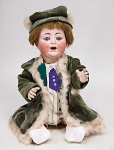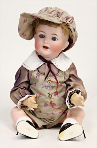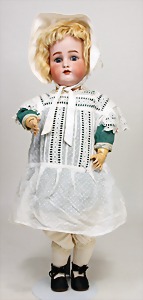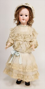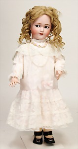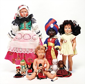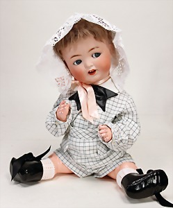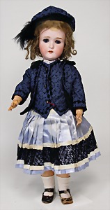 3 Puppen, 1 x Porzellan, gem. AM 360N, Hinterkopf geklebt, blaue fest eingesetzte Glasaugen, off. Mund, Zähne, Echthaarperücke, Masse-Sitzbabykörper, mit abstehendem Zeh, Körper stark bespielt, stellenw. überstrichen, 29 cm, 1 x Masse-Puppe, gem. Heubach Köppelsdorf 342, blaue Schlafaugen, off. Mund, Zähne, Echthaarperücke, Masse-Stehbabykörper, rechter Fuß fehlt, 25 cm, 1 x Kunststoff-Puppe, gem. Pedygree Made in England, blaue Schlafaugen, off. Mund, Zähne, Kunsthaarperücke, 39 cm