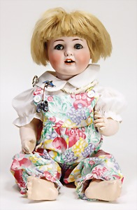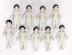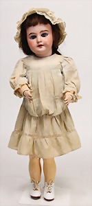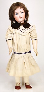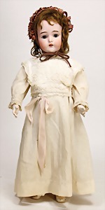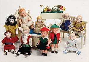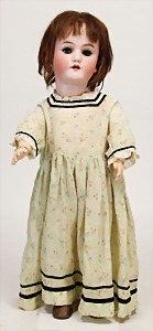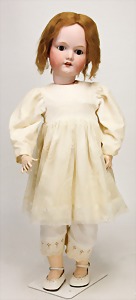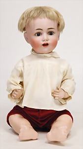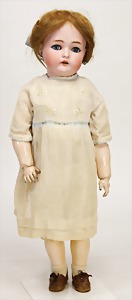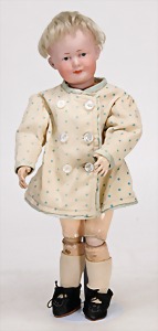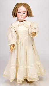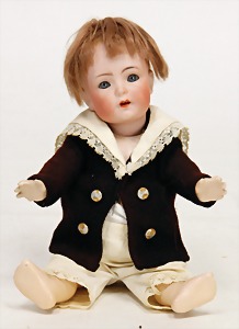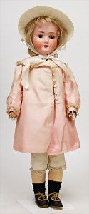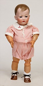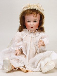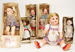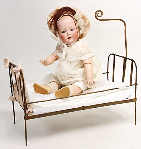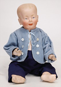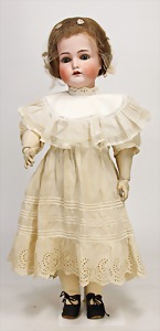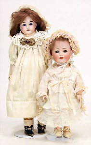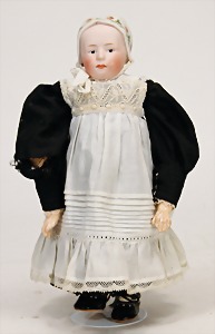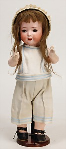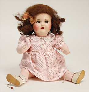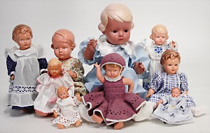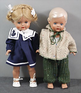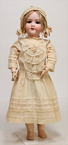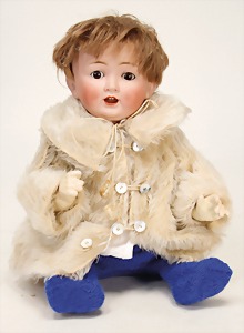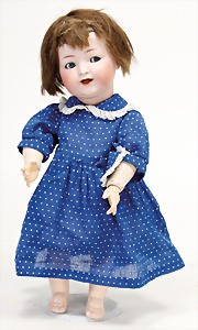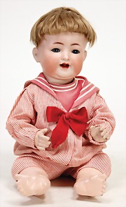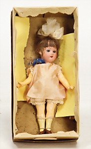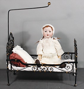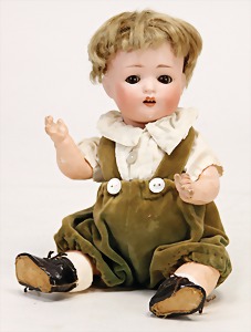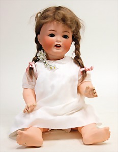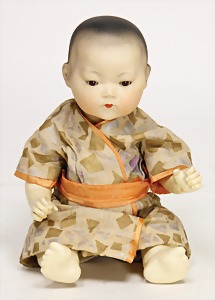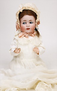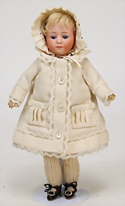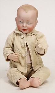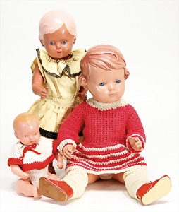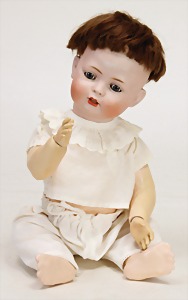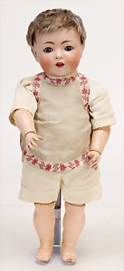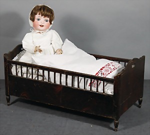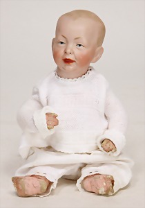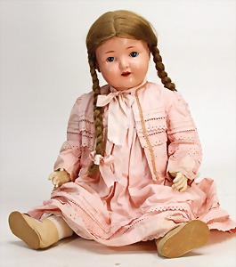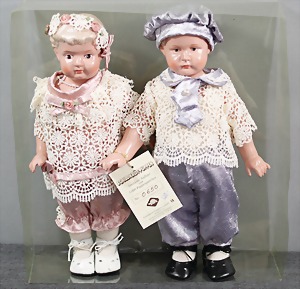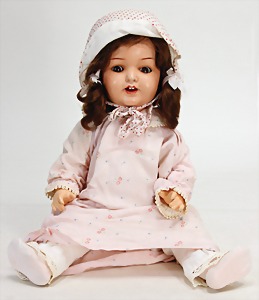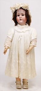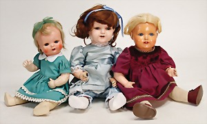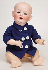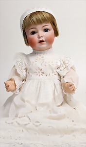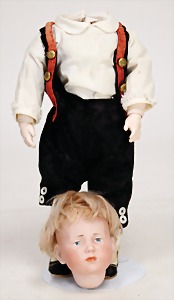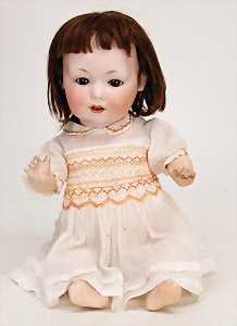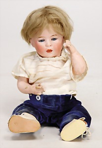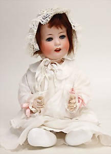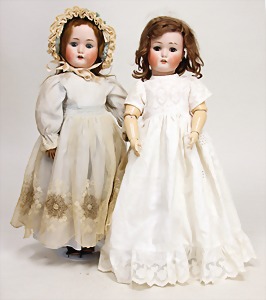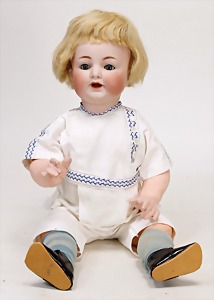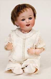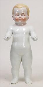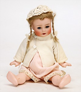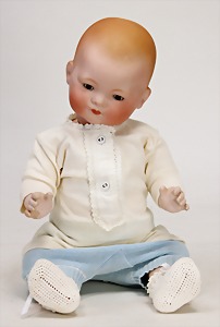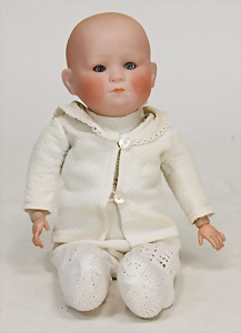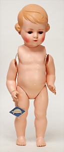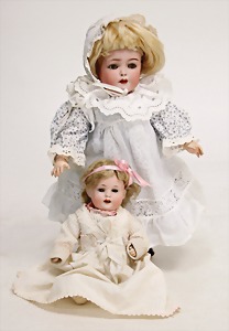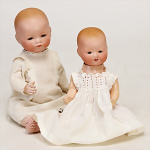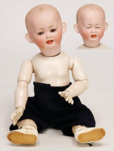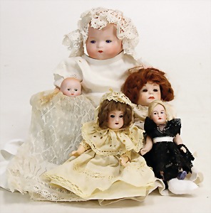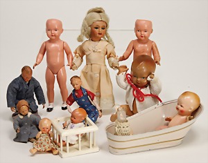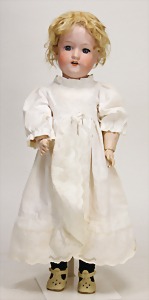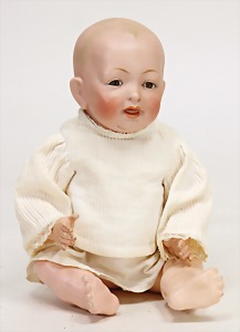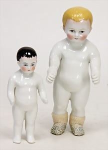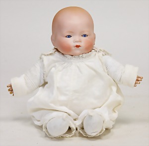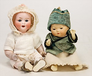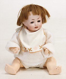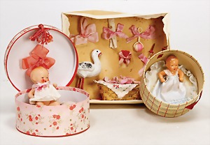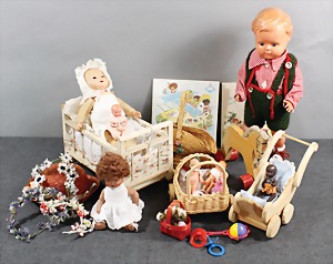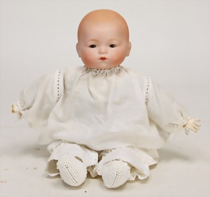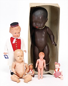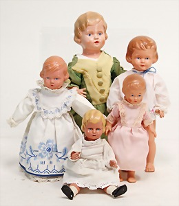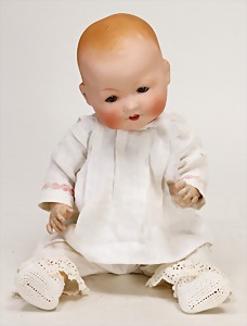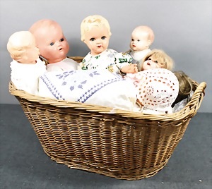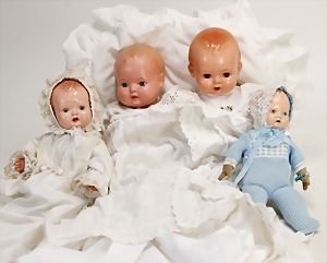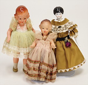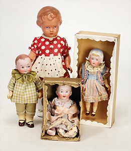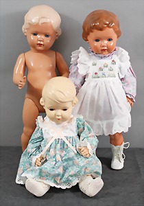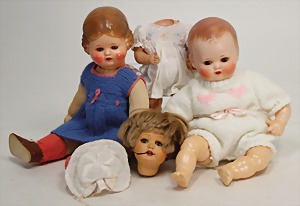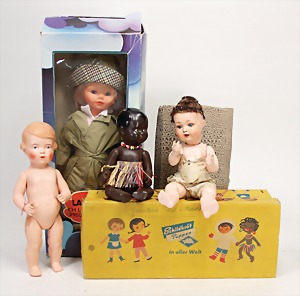 3 Celluloid-Puppen, 1x Celluloid-Vollkopf, ungem., blaue gemalte Augen, Liegestellen ausgebessert, Nasenspitze etwas eingedrückt, auf Celluloid-Sitzbabykörper, muss neu aufgezogen werden, 54 cm, 1x Kämmer Reinhard, gem. 721 SoR, blaue Schlafaugen, off. Mund, 2 Zähne oben, Zunge, Risse am rechten Auge, Mohair-Perücke, auf Masse-Stehbabykörper, komplett überstrichen, 50 cm, 1x Masse-Einbindekopf, Baby-Vollkopf, ungemarkt, blaue fest eingesetzte Glasaugen, off. Mund, Zunge, Stoffkörper, Masse Arme und Beine, 55 cm