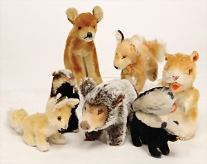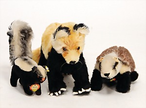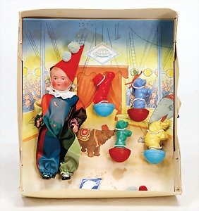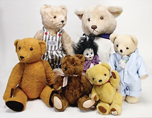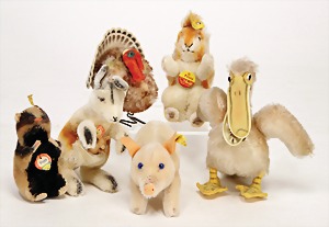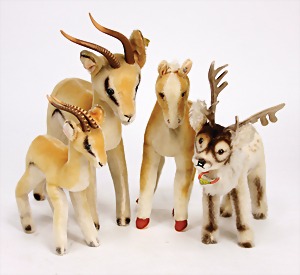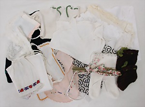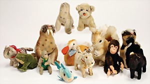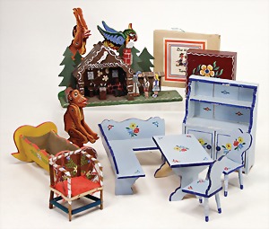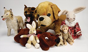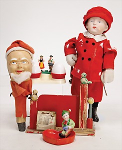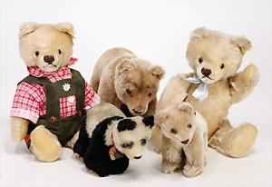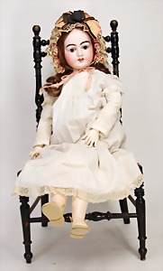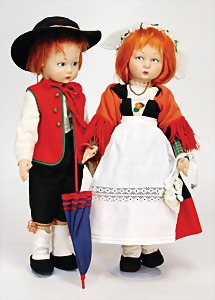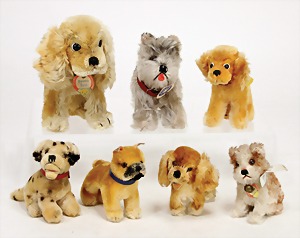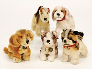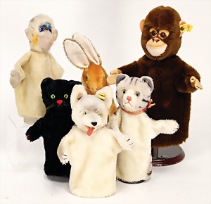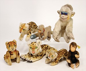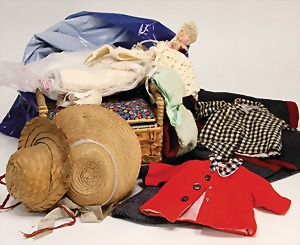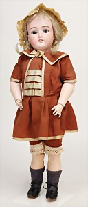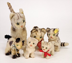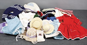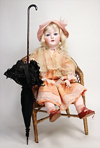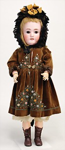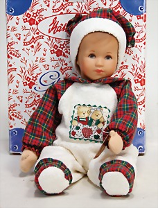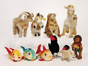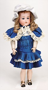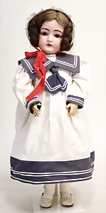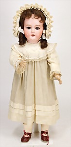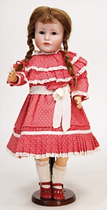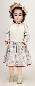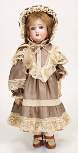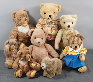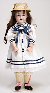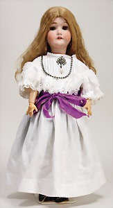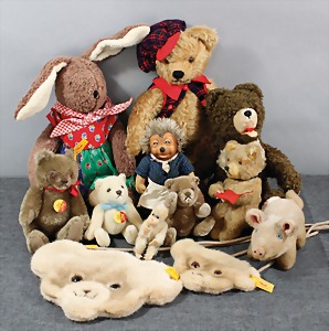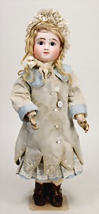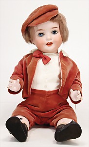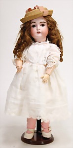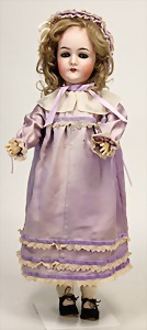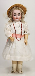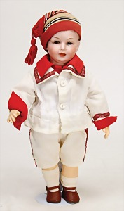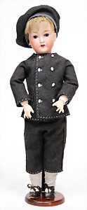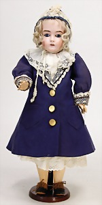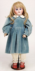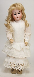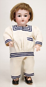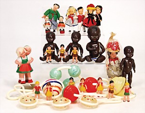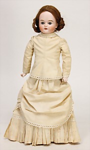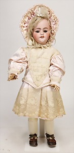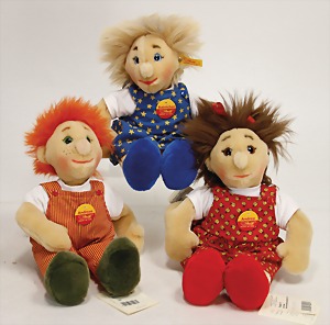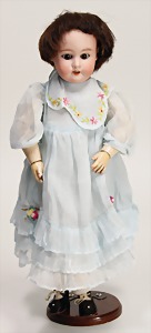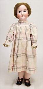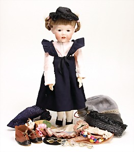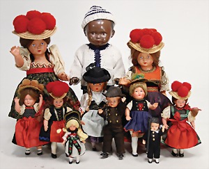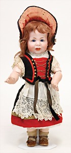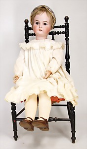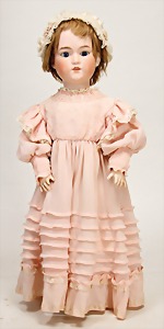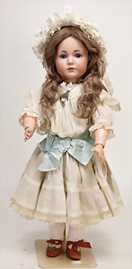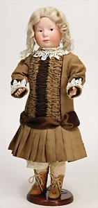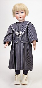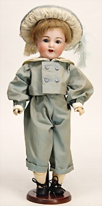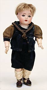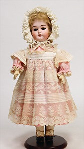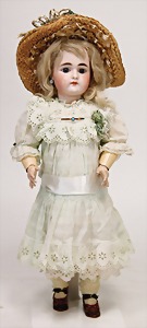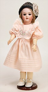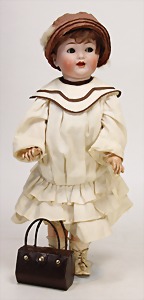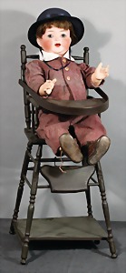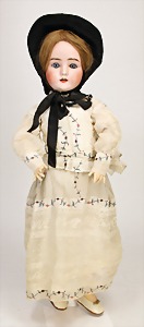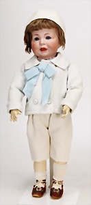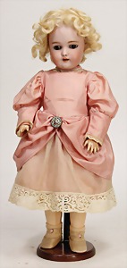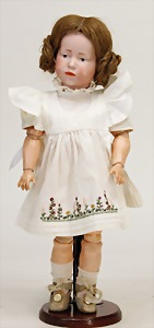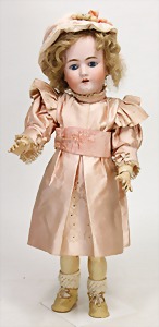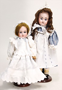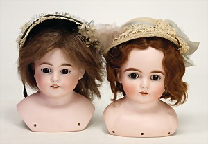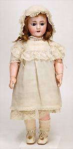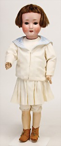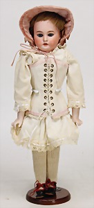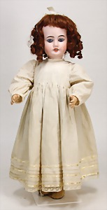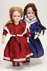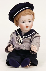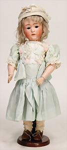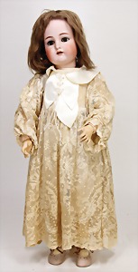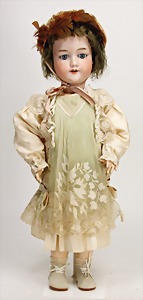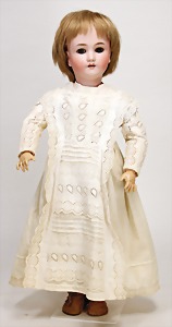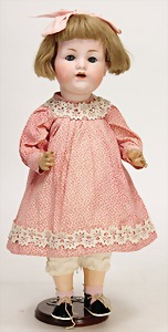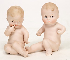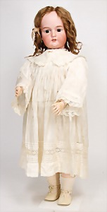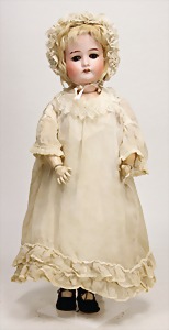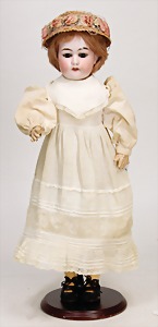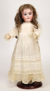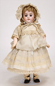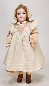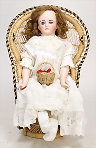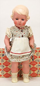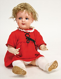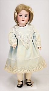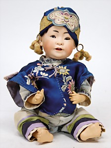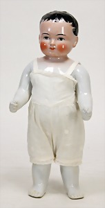 3 Celluloid-Puppen, 1x Celluloid-Vollkopf, ungem., blaue gemalte Augen, Liegestellen ausgebessert, Nasenspitze etwas eingedrückt, auf Celluloid-Sitzbabykörper, muss neu aufgezogen werden, 54 cm, 1x Kämmer Reinhard, gem. 721 SoR, blaue Schlafaugen, off. Mund, 2 Zähne oben, Zunge, Risse am rechten Auge, Mohair-Perücke, auf Masse-Stehbabykörper, komplett überstrichen, 50 cm, 1x Masse-Einbindekopf, Baby-Vollkopf, ungemarkt, blaue fest eingesetzte Glasaugen, off. Mund, Zunge, Stoffkörper, Masse Arme und Beine, 55 cm