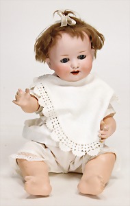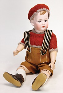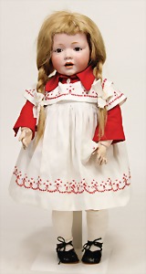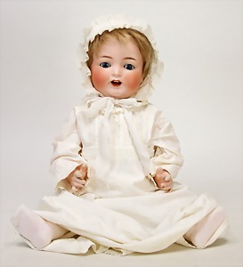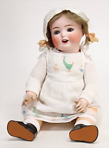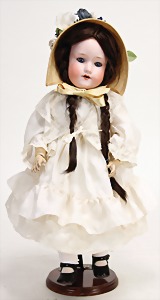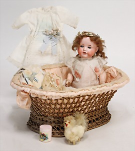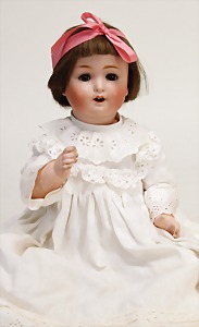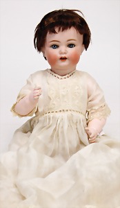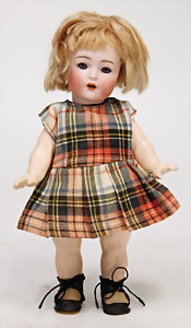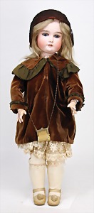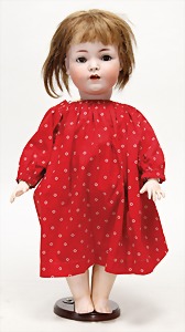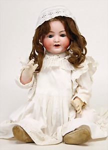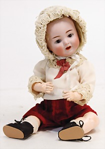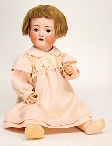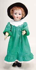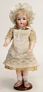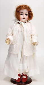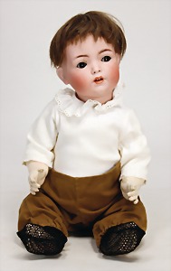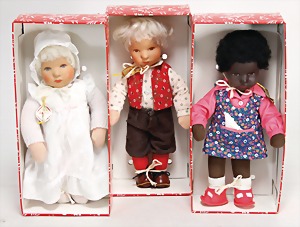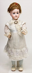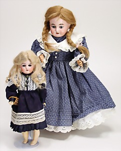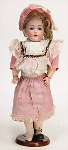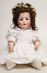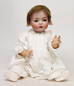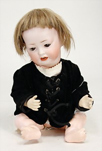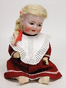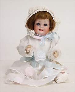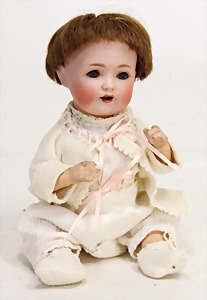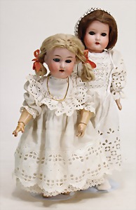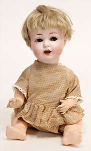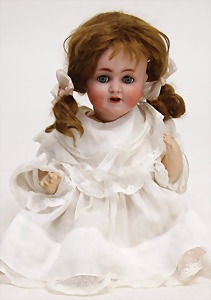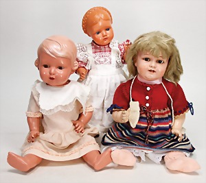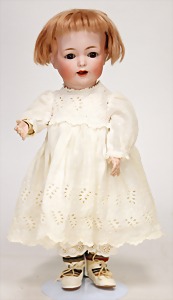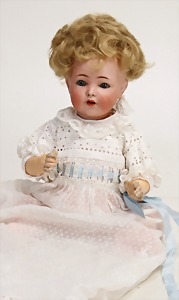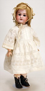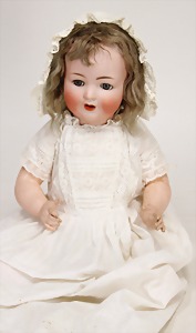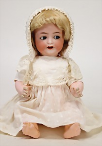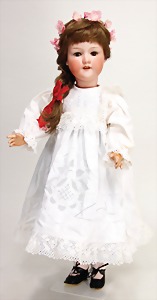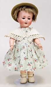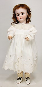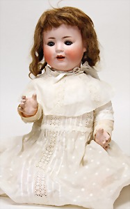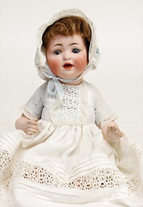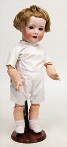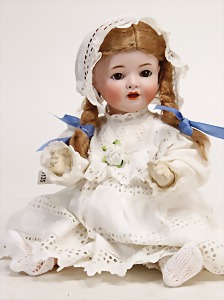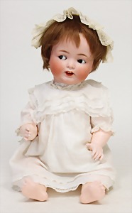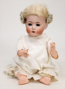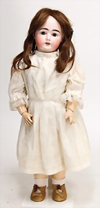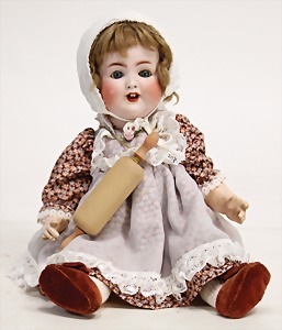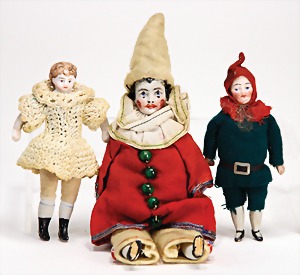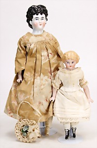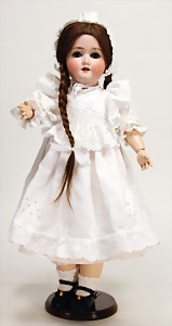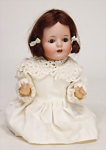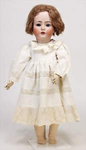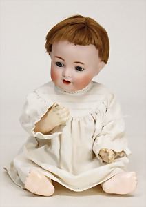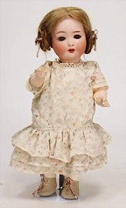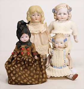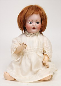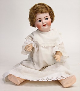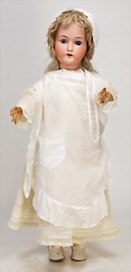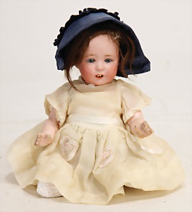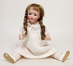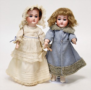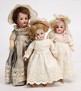 3 Porzellankopf-Puppen, 1 x gem. Simon & Halbig 21, braune Schlafaugen, off. Mund, Zähne, Masse-Stehkörper, mit anmodellierten Schuhen u. Strümpfen, 21 cm, 1 x gem. Made in Germany 12, braune fest eingesetzte Glasaugen, off. Mund, Zähne, Mohairperücke, Masse-Stehkörper, mit anmodellierten Schuhen u. Strümpfen, Schuhe nachtr. unschön modelliert, 20 cm, 1 x AM 390, braune fest eingesetzte Glasaugen, off. Mund, Zähne, Echthaarperücke, Masse-Stehkörper, mit anmodellierten Stiefeln, 23 cm