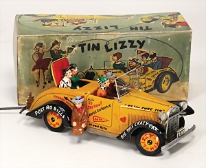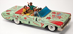 Ford, Made in Spain, Serie: Musical, Beatles, Blech lithogr., 48 cm, Batterieantrieb mit Stimme, Kunststoff-Figuren, mit Papier-Plakette: IMPORTANTE Pulsar "VOZ" con palanca posición "MARCHA" Esperar termine para volver positión "PARO" GRACIAS, ein wenig eingestaubt u. ein paar Lagerungsspuren, sonst schöner Zust., techn. nicht geprüft, auf Kühlergrill aufgemalt: "die 4 Pilzköpfe"