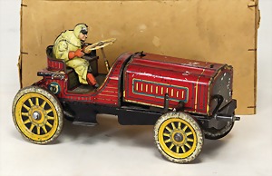 Rennwagen, Blech lithogr., 20 cm, Zahnrad zum aufziehen, dreht durch, Fahrerfigur, Orig.-Zust. mit altersbed. Lackfehlern